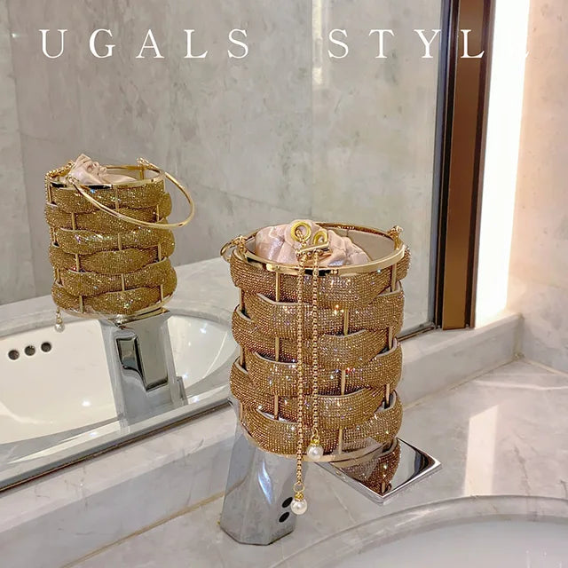 Woven Rhinestone Bucket Bag Woven Clutch Bags Women Boutique Multicolor Crystal Hollow Out Metal Purses And Handbags Wedding